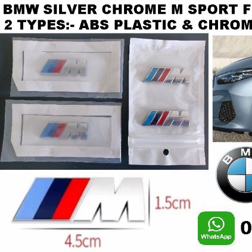 BMW Motorsport M Silver Fender badges emblems BMW M Motorsport silver fender badges / emblems. Choice of 2 types available:- Metal chrome or ABS Plastic silver. OEm size 45mm x 15mm. Both types are easy to stick on using the double sided tape on each badge.