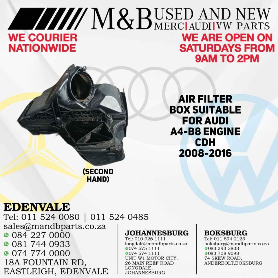 Air Filter Box (Second Hand) Suitable for Audi A4-B8 Engine CDH 2008-2016 Part Number: 8K0 183A Air Filter Box (Second Hand) Suitable for Audi A4-B8 Engine CDH 2008-2016 Part Number: 8K0 183A π Branch:EDENVALE,BOKSBURG,JHB π¨βπ§ M and B π¨βπ§ USED AND NEW MERC/AUDI/VW PARTS β WE ARE CURRENTLY STRIPPING β W163...