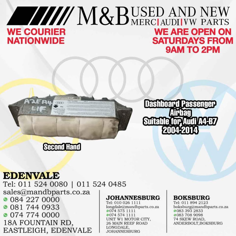Dashboard Passenger Airbag (Second Hand) Suitable for Audi A4-B7 2004-2015 Part number: 8E2880204B Dashboard Passenger Airbag (Second Hand) Suitable for Audi A4-B7 2004-2015 Part number: 8E2880204B π Branch:EDENVALE, BOKSBURG,JHB π¨βπ§ M and B π¨βπ§ USED AND NEW MERC/AUDI/VW PARTS β WE ARE CURRENTLY STRIPPING β ...