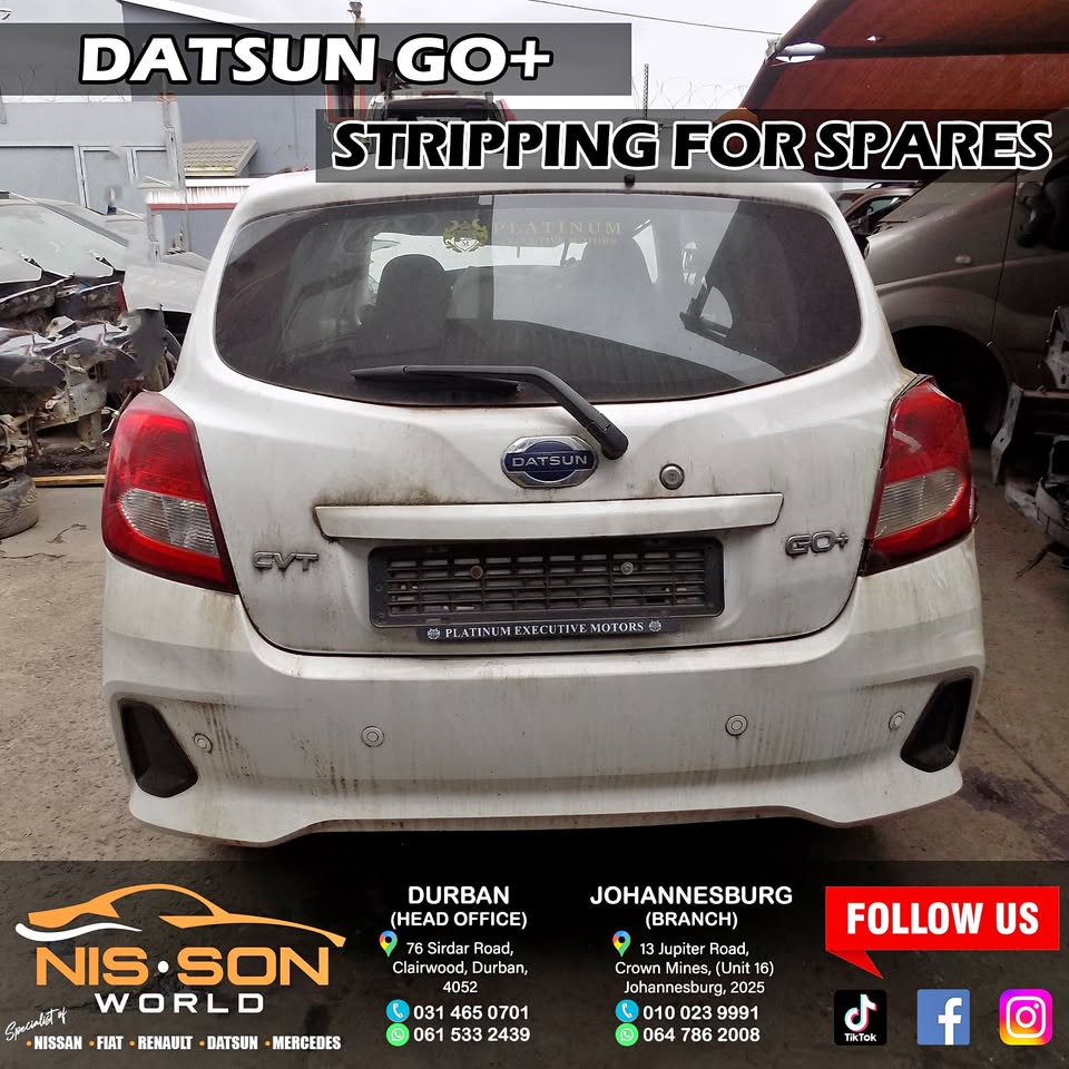 Datsun Go Plus Stripping For Spares NISSON WORLD Specialist of : Nissan - Fiat - Renault - Datsun - Mercedes New & Used spares available Durban (Head Office) Tel : Whatsapp : 061 533 2439 76 Sirdar Road, Clairwood, Durban