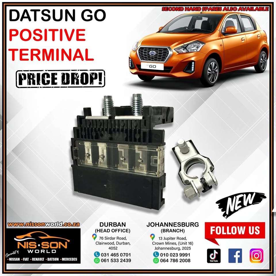 Datsun Go Positive Terminal NISSON WORLD Specialist of : Nissan - Fiat - Renault - Datsun - Mercedes New & Used spares available Durban (Head Office) Tel : Whatsapp : 061 533 2439 76 Sirdar Road, Clairwood, Durban