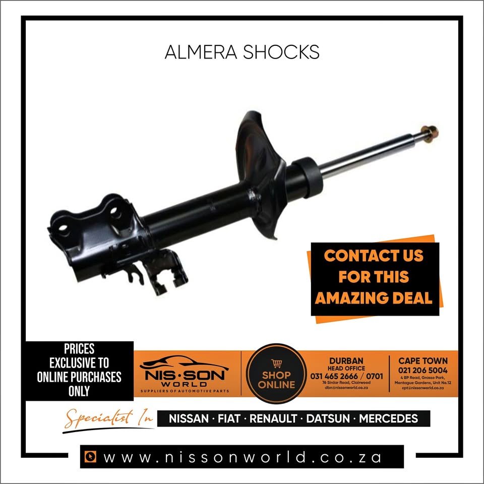 Nissan almera shocks Nissan Almera shocks ____________________________________________ Contact us 📞 / 📱WhatsApp - 📧 📌76 Sirdar road Clairwood Durban