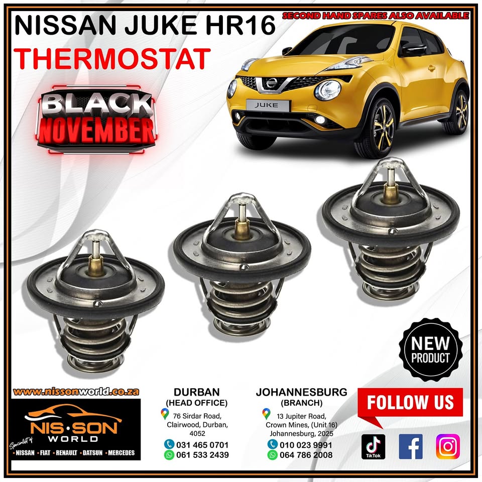 NISSAN JUKE HR16 THERMOSTAT NISSON WORLD Specialist of : Nissan - Fiat - Renault - Datsun - Mercedes New & Used spares available Durban (Head Office) Tel : Whatsapp : 061 533 2439 76 Sirdar Road, Clairwood, Durban