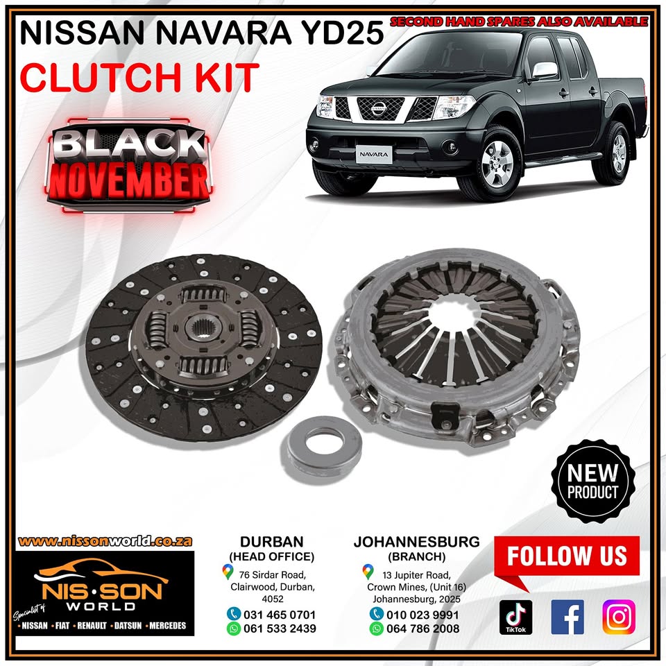 NISSAN NAVARA YD25 CLUTCH KIT NISSON WORLD Specialist of : Nissan - Fiat - Renault - Datsun - Mercedes New & Used spares available Durban (Head Office) Tel : Whatsapp : 061 533 2439 76 Sirdar Road, Clairwood, Durban