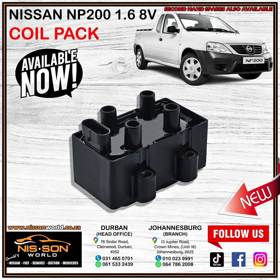 NISSAN NP200 1.6 8V COIL PACK Specialist of : Nissan - Fiat - Renault - Datsun - Mercedes New & Used spares available Johannesburg (Branch) Call : Whatsapp : 064 786 2008 13 Jupiter Road, Crown Mines, Unit No.16 Durban (Head Office) Tel : Whatsa...