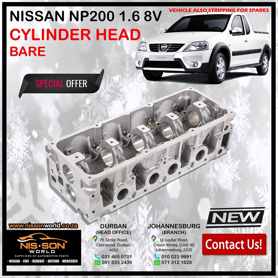 NISSAN NP200 1.6 8V CYLINDER HEAD (BARE) NISSON WORLD Specialist of : Nissan - Fiat - Renault - Datsun - Mercedes New & Used spares available Durban (Head Office) Tel : Whatsapp : 061 533 2439 76 Sirdar Road, Clairwood