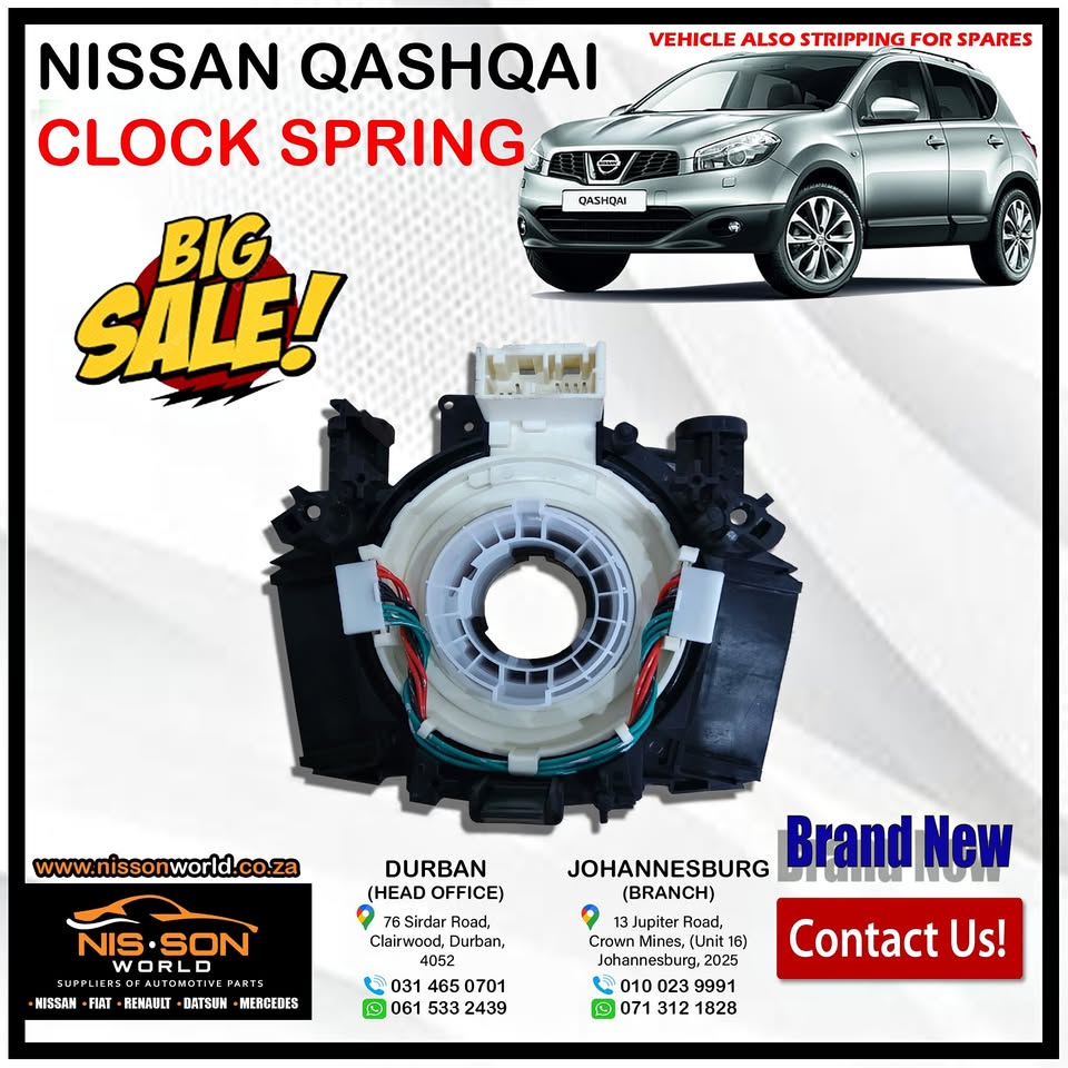 NISSAN QASHQAI CLOCK SPRING NISSON WORLD Specialist of : Nissan - Fiat - Renault - Datsun - Mercedes New & Used spares available Durban (Head Office) Tel : Whatsapp : 061 533 2439 76 Sirdar Road, Clairwood