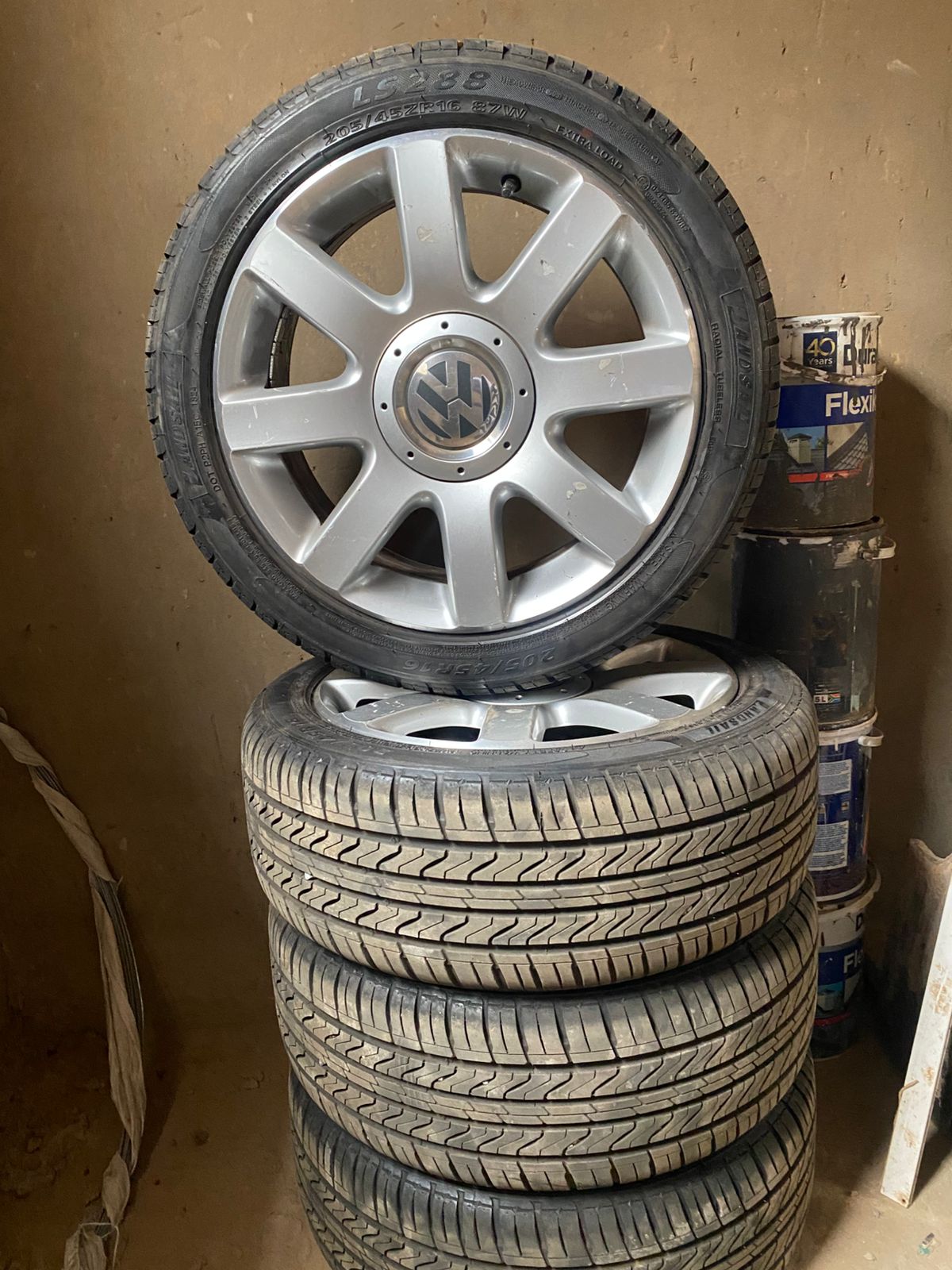 Tyres and rims set of 4. 205/45R16 New, used once. Too small for my car.